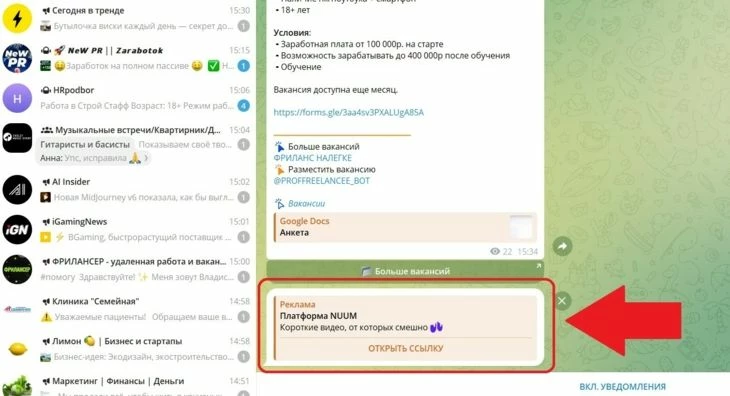 Продвижение в тематических каналах и чатах: креативы могут публиковаться в тематических каналах и ботах, но это требует согласия владельцев и происходит через договоренности с ними. Больше о рекламе в Телеграм здесь.