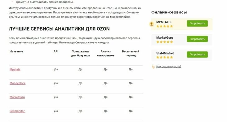 Рекламу можно настроить с помощью партнерских программ крупных компаний, например Amazon Associates, партнерка Озона, либо с помощью CPA-сетей вроде Admitad, которые агрегируют офферы рекламодателей, создают аффилированные ссылки и выдают промо-материалы. В качестве примера приведем партнерские материалы сервисов для аналитики маркетплейсов в информационной статье-обзоре на сайте pgdv.ru предпринимателя и блогера Сергея Погодаева.