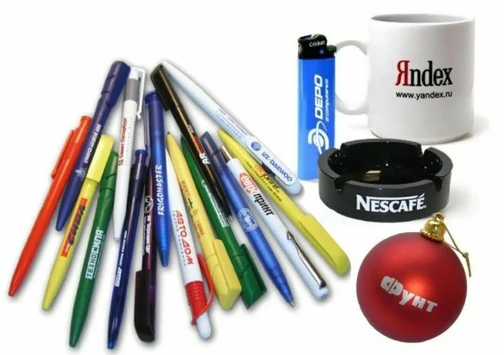 Сувенирная реклама реализована как раздача или распространение брендированных предметов, например ручки, кружки, футболки. Особенность — долговечность, поскольку сувениры могут использоваться длительное время. Преимущества — повышение узнаваемости бренда, практичность сувениров. Но эффективность ограничена, если предмет не используется получателем или плохо связан с компанией.