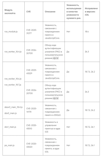 Наконец, в феврале 2026 года была закрыта уязвимость CVE-2026-20700 в компоненте Dynamic Link Editor. Она была устранена в iOS 26.3 после подтверждения того, что ее также можно эксплуатировать на практике.